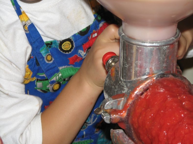 Everyone gets in on the action. And everyone has a job to do. Mine is to gather up the tomatoes, wash them, take of the nasty parts, and cut them into manageable pieces. Nick's job is to set everything up, manage the kids, oversee the Using Of The Machine, tear down, dump juice from the pan to the large kettle, and anything else that I don't feel like doing!!! (Thank you so much, Nick.) He really is the driving force at making puree. I love love love to use it - in tomato soup, making tomato eggs (eggs poached in the juice - so wonderful!), in soups and stews, etc. But, I have such an aversion to actually making it.